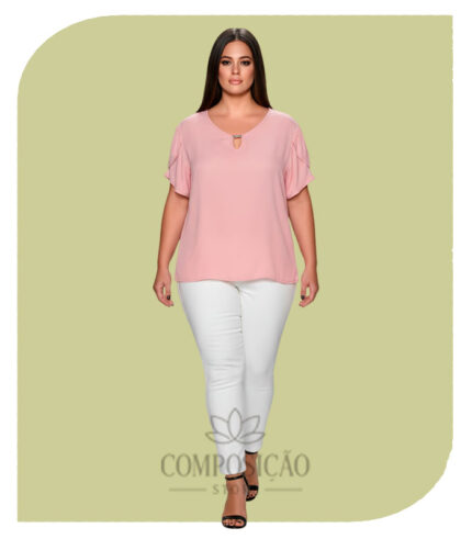 Blusa Plus Size Rosa Quartzo com Detalhe Metalizado e Mangas Franzidas