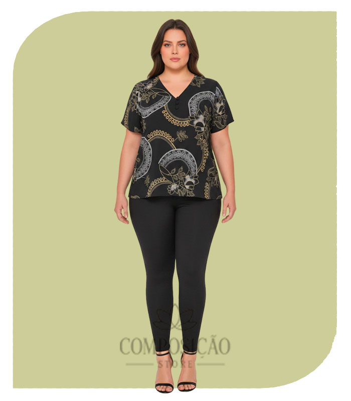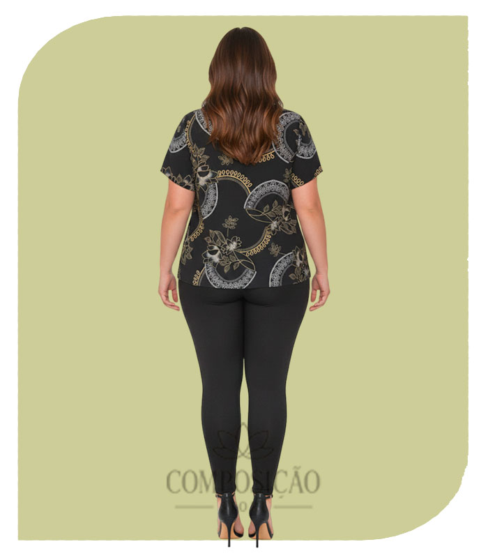 Esta Blusa Plus Size em fundo Preto é uma peça de destaque, ideal para looks sofisticados e modernos. A estampa exclusiva combina motivos florais com elegantes detalhes que imitam correntes e arabescos nas cores dourado e off-white, criando um visual luxuoso e chamativo.