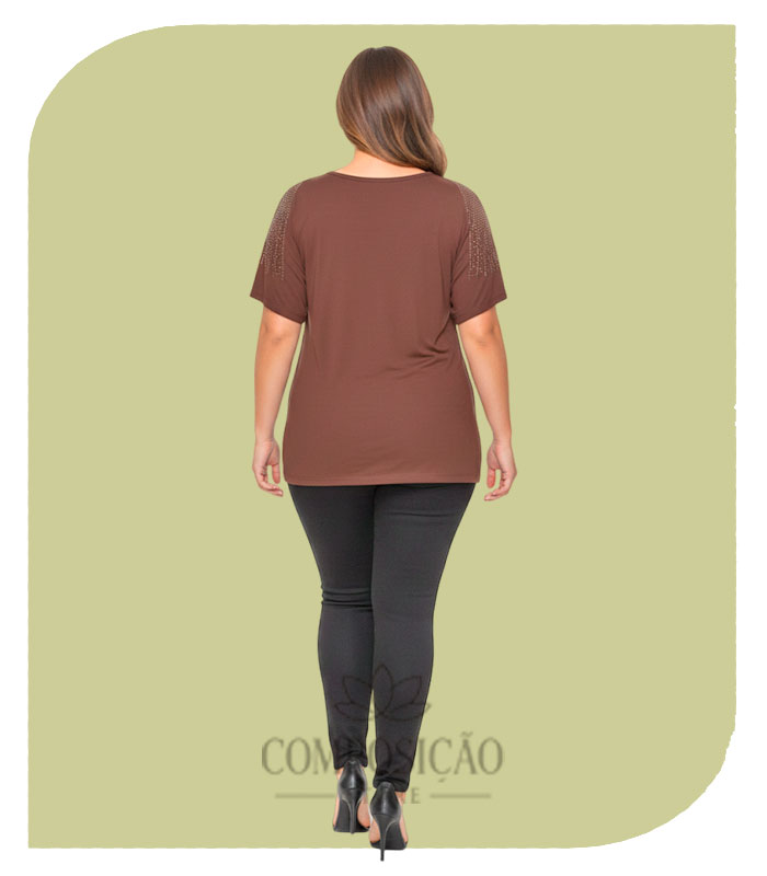 Ponto Focal: Detalhes de brilho e strass aplicados nas mangas curtas, elevando a peça básica a um nível de sofisticação.