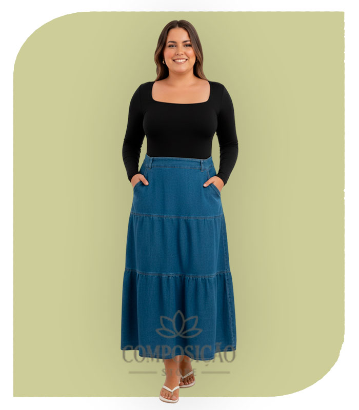 Apaixone-se pela nossa Saia Longa Jeans em Babados, a peça que une a durabilidade e o estilo atemporal do denim a uma modelagem feminina e romântica. Com camadas fluidas que proporcionam um movimento encantador, esta saia é perfeita para criar looks que vão do casual ao sofisticado, sempre com muito conforto. A lavagem média do jeans facilita as combinações, tornando-a um item versátil para todas as estações.