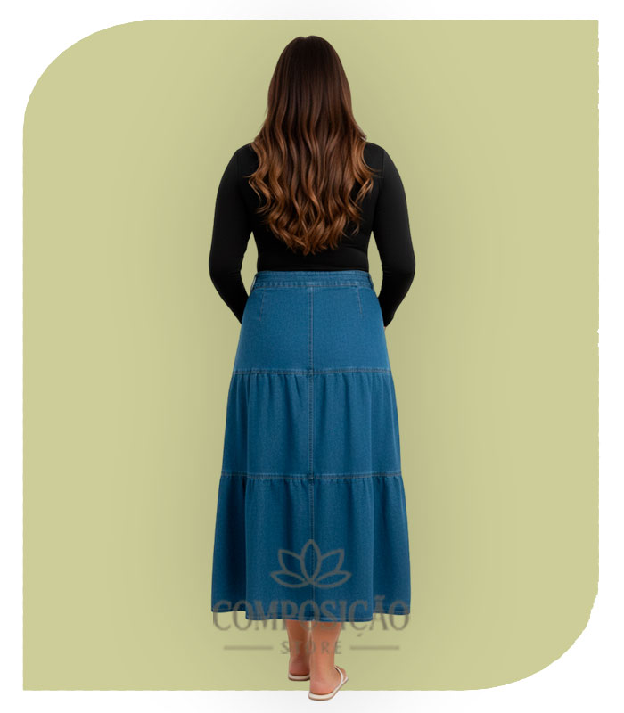 Saia Longa Jeans em Babados (Estilo Marias) – Lavagem Média